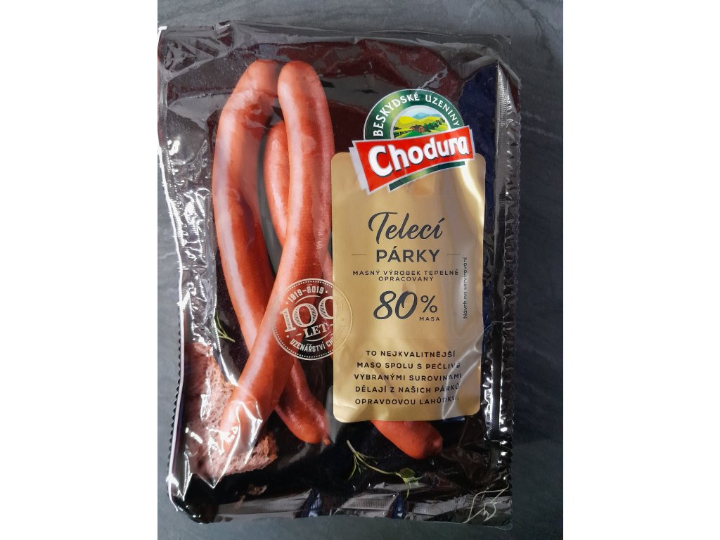 Složení: telecí maso 40%, vepřové maso 40%, pitná voda, bramborový škrob, jedlá sůl, dextróza, koření, antioxidant, kyselina L-askorbová, kyselina citrónová, dusitan sodný, glutaman sodný, extrakty koření, barvivo, přírodní skopové střívko.