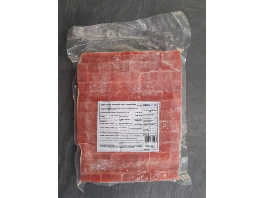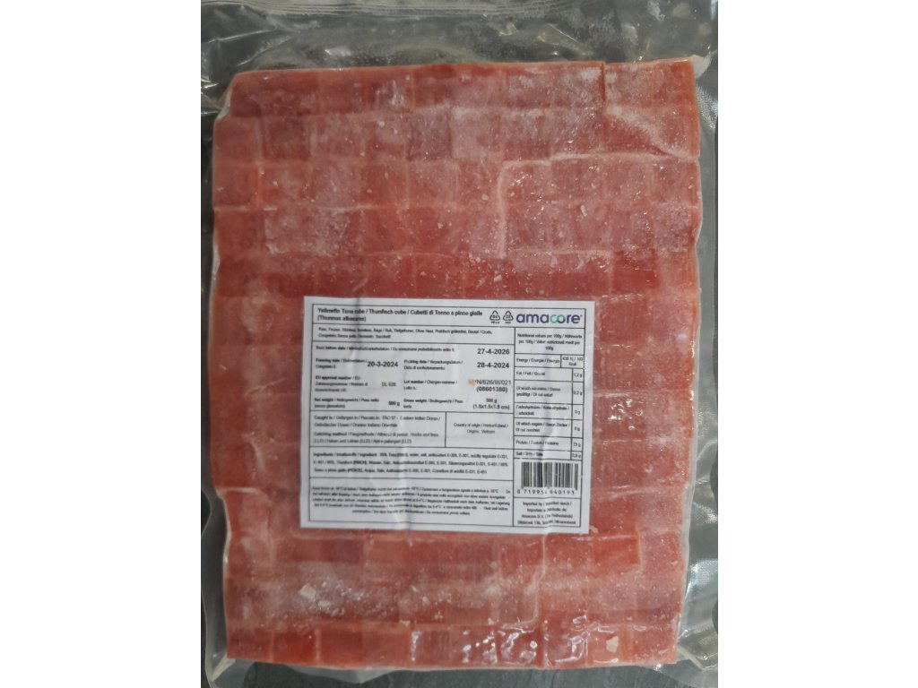 Tuňák žlutoploutvý kostky, mražený 500 gramů.